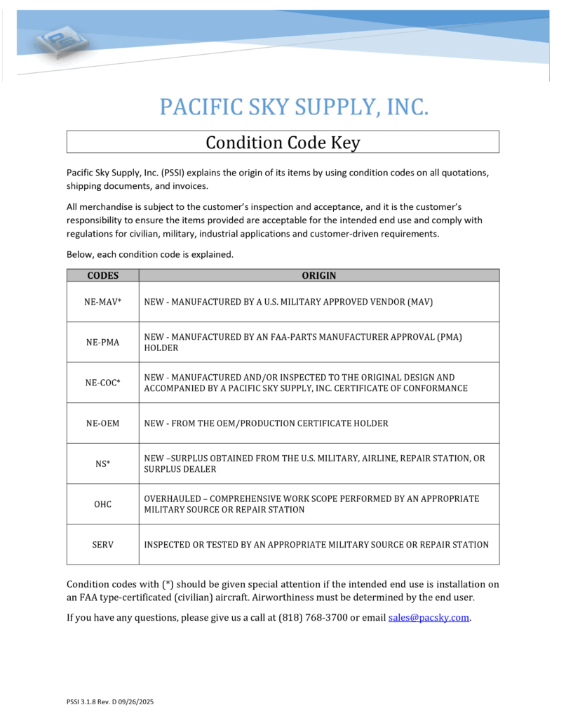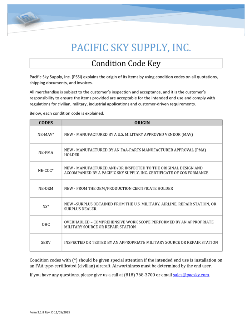 At Pacific Sky Supply, Inc. we want to be clear about the type of product we provide so we created the following Condition Code Key.